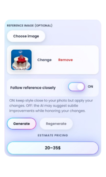 Start by telling us your cake’s style, servings, flavor, and layers. Sprinkle in any special wishes, and pop in a reference photo if you like. Then click Generate!